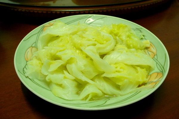 材料:高麗菜半顆、蒜頭3瓣、油一大匙、鹽少許、1~1.5碗清水